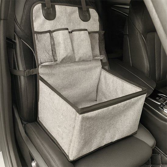 Pourquoi choisir entre esthétique et fonctionnalité? Ce siège d'auto au design épuré en tissu gris chiné s'harmonise parfaitement avec l'intérieur de votre véhicule, qu'il soit classique ou moderne. Les compartiments de rangement latéraux vous permettent d'avoir toujours à portée de main les essentiels pour votre animal: bouteille d'eau, laisse, friandises ou jouet préféré. Sa structure pliable facilite le rangement quand vous ne l'utilisez pas.
